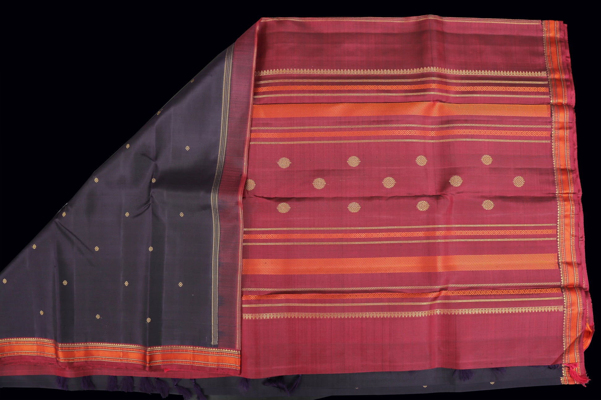 Jamun color saree with small flower zari butta saree with contrast orange silk thread border and a beautiful pallu .