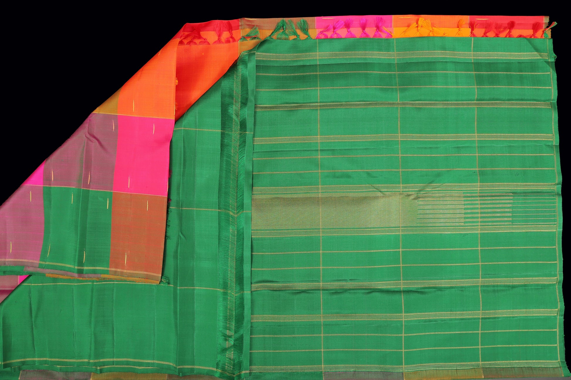 Multi color as we call palum pazhamum kattam with brad checks and beautiful rain drop motif with contrast green pallu and blouse .