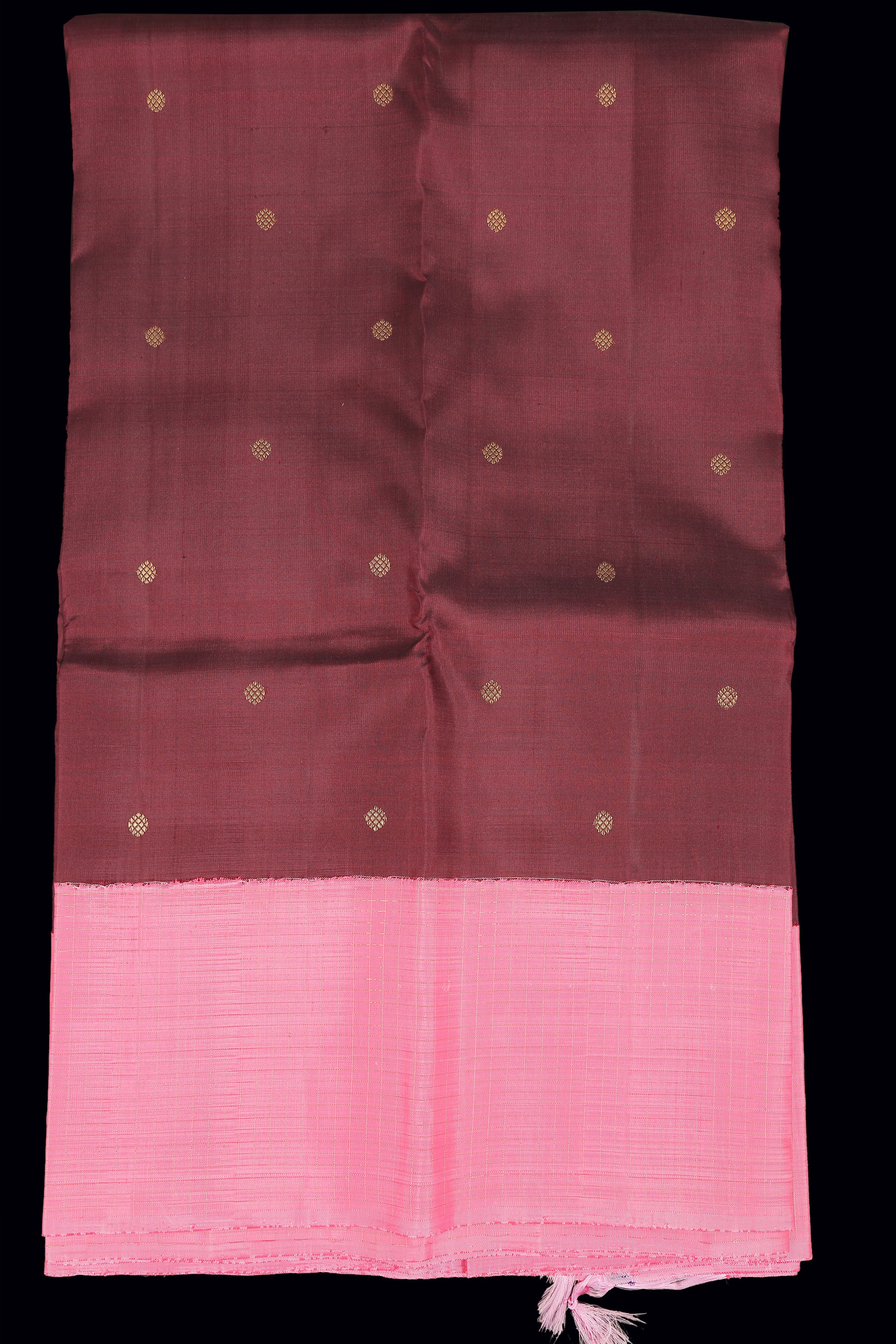 Wine shade saree with corvai pink border .zari checks throughout the border and grand pallu .